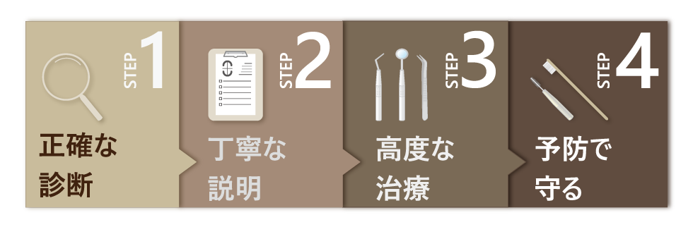 正確な原因究明→丁寧な治療→再発予防のサイクルで、長期間にわたる口腔内の健康を実現します。